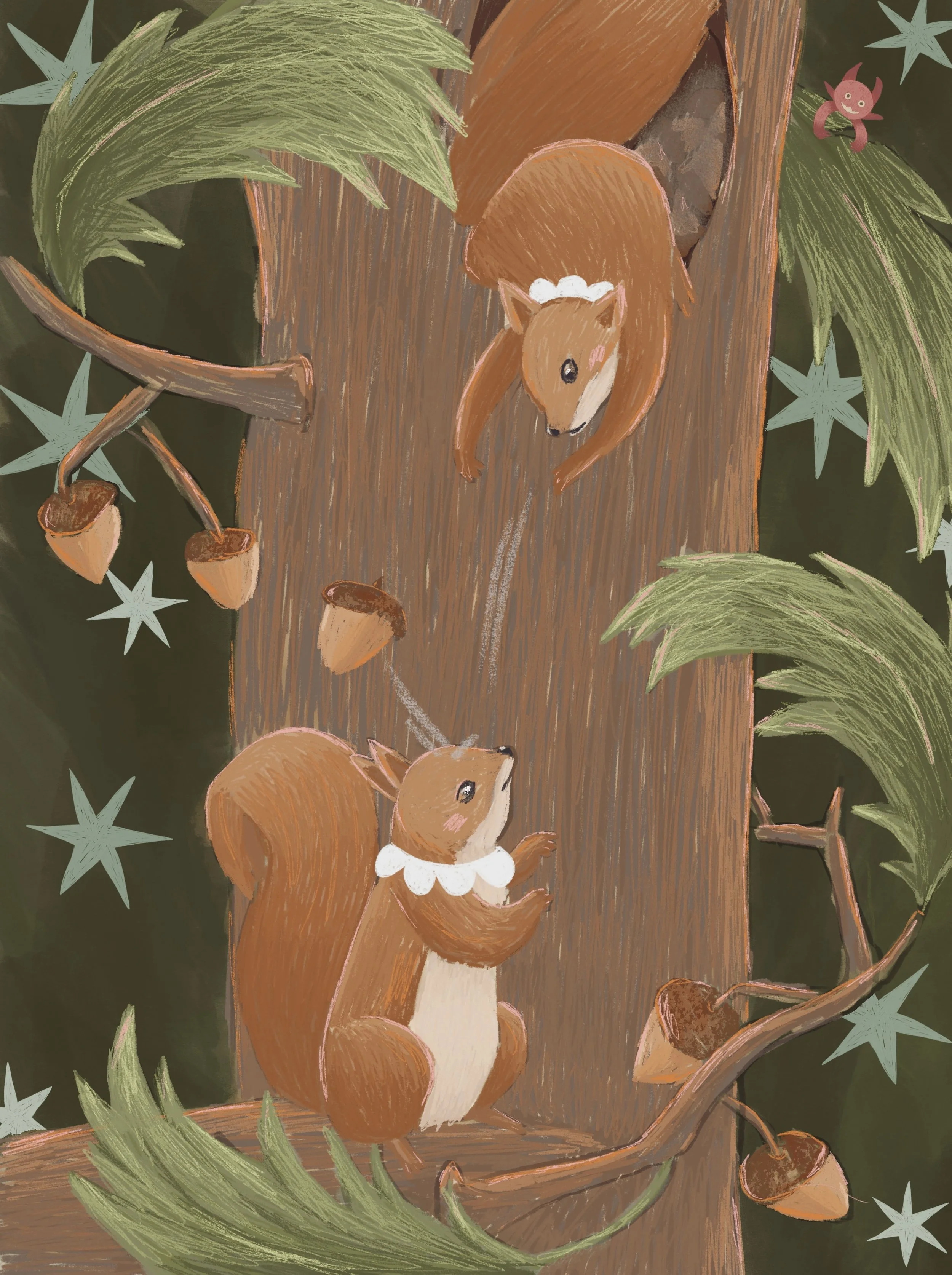 Day 1: Acorn Squirrels storing their acorns when one drops one on their friends head. Was it an accident?..