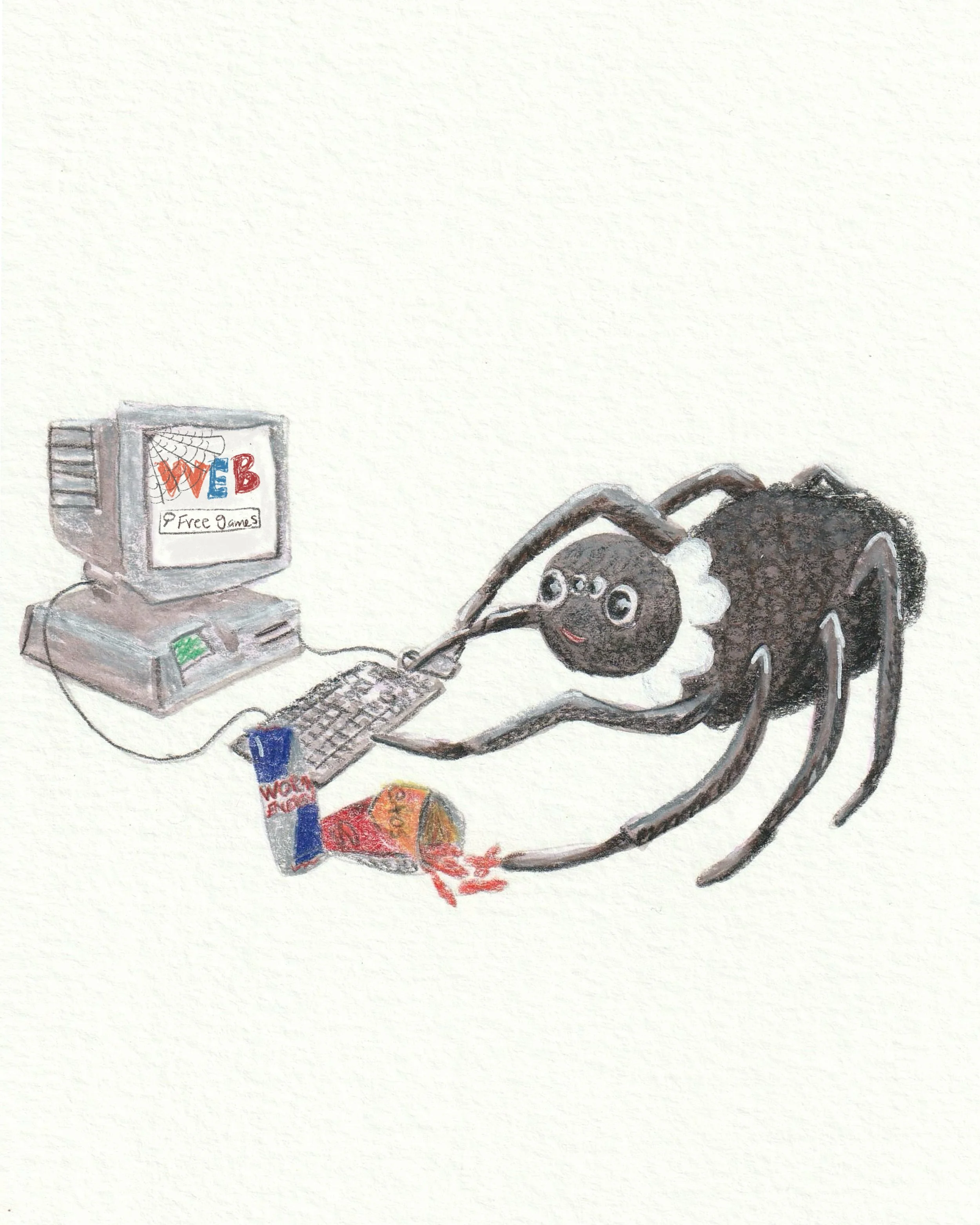Day 22: web A spider looking for games on the web...eating Cheetos and drinking worms??